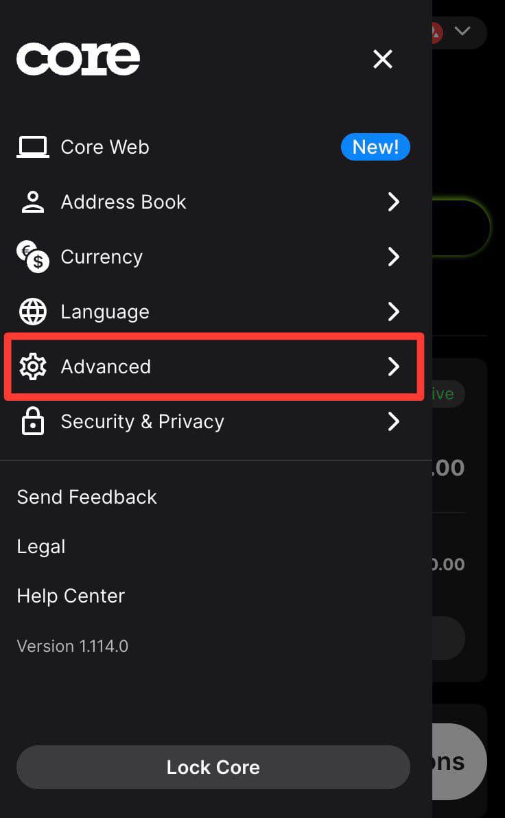 To switch to Testnet Mode, open the Core browser extension, click on the burger menu, then Advanced, and finally activate Testnet Mode.
