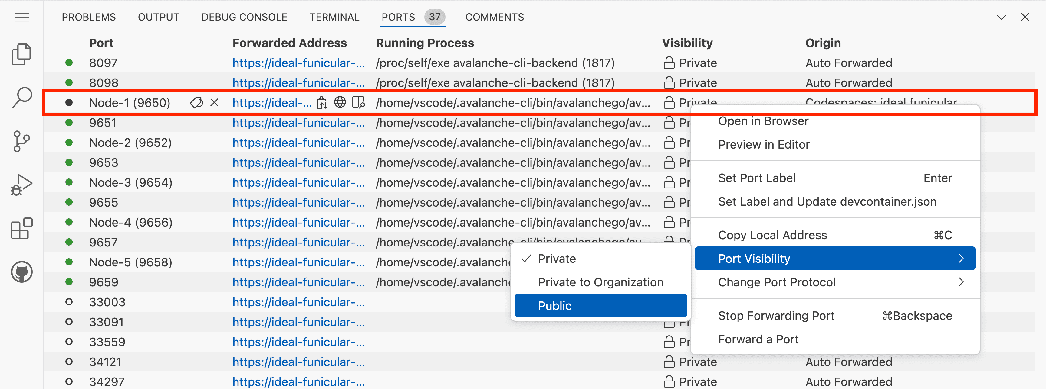 After the network starts, all ports are closed by default in Codespaces. You need to make the necessary ports public, like port 9650 for RPC access: