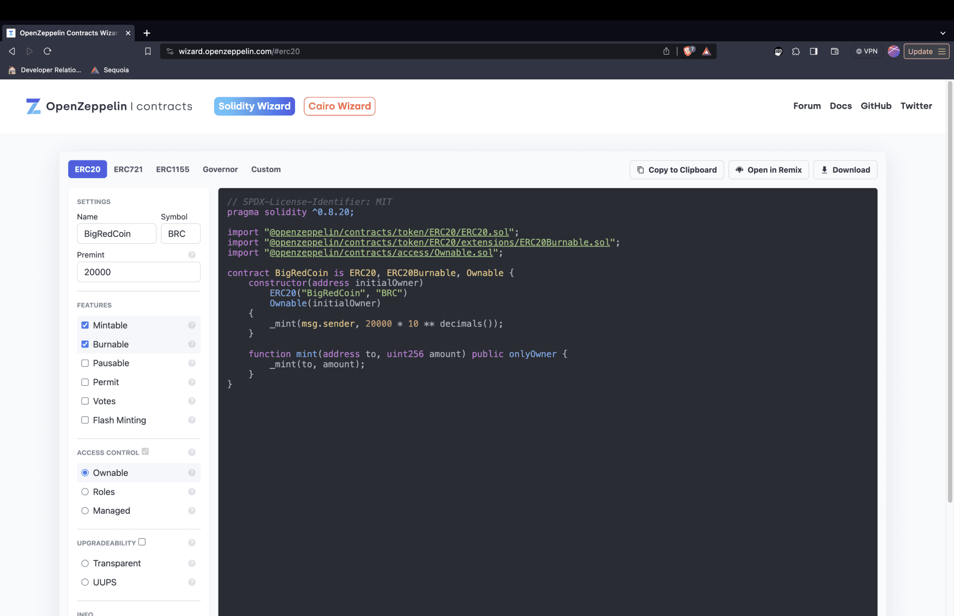 In the above, we've created a new ERC-20 contract named BigRedCoin. Furthermore, this ERC-20 token allocates to the deployer 20000 tokens on initialization and gives the owner full rights over the behavior of the token. Now that we have our ERC-20 token contract customized, how do we actually deploy it?
