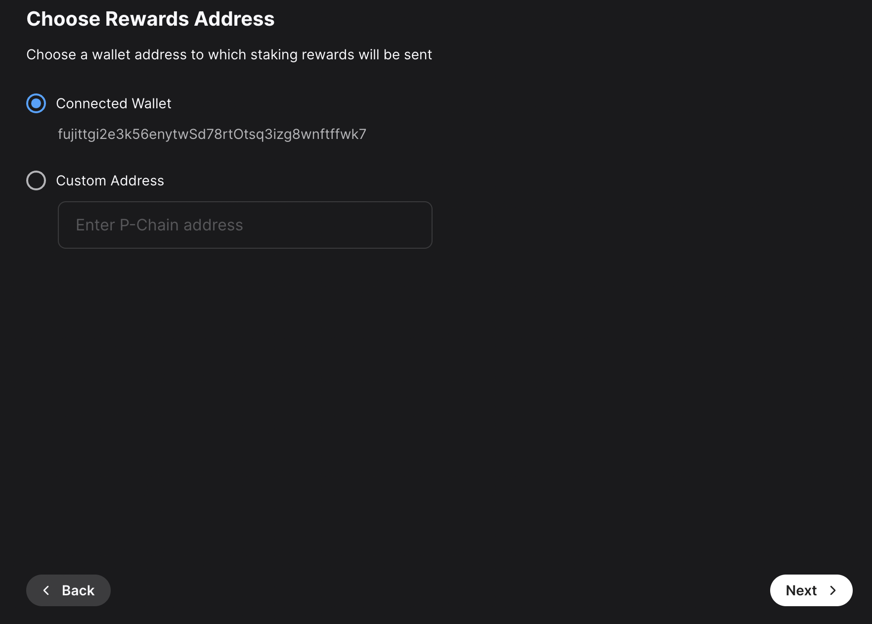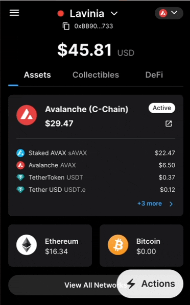 ); } ``` ## Cross-Chain Operations JSON-RPC accounts support cross-chain operations through the Avalanche Client SDK: ```typescript // P-Chain export transaction const pChainExportTxn = await walletClient.pChain.prepareExportTxn({ destinationChain: "C", fromAddress: address, exportedOutput: { addresses: [address], amount: avaxToWei(0.001), }, }); const txHash = await walletClient.sendXPTransaction(pChainExportTxn); ``` ## Best Practices ### 1. Check Provider Availability ```typescript // Always check if the provider is available if (typeof window !== "undefined" && window.avalanche) { // Core is available } else if (typeof window !== "undefined" && window.ethereum) { // MetaMask is available } else { // No wallet provider found } ``` ### 2. Handle Network Switching ```typescript // Check if wallet is on the correct network const currentChainId = await walletClient.getChainId(); if (currentChainId !== avalanche.id) { await walletClient.switchChain({ id: avalanche.id }); } ``` ### 3. Graceful Error Handling ```typescript const handleWalletError = (error: any) => { switch (error.code) { case 4001: return "User rejected the request"; case -32002: return "Request already pending"; case -32602: return "Invalid parameters"; default: return error.message || "Unknown error occurred"; } }; ``` ## Troubleshooting ### Common Issues **Provider Not Found** ```typescript // Check if provider exists if (!window.avalanche && !window.ethereum) { throw new Error("No wallet provider found. Please install Core or MetaMask."); } ``` **Wrong Network** ```typescript // Ensure wallet is on the correct network const chainId = await walletClient.getChainId(); if (chainId !== avalanche.id) { await walletClient.switchChain({ id: avalanche.id }); } ``` **User Rejection** ```typescript try { await walletClient.send({ to: address, amount: 0.001 }); } catch (error) { if (error.code === 4001) { console.log("User rejected transaction"); } } ``` ## Next Steps - **[Local Accounts](accounts/local)** - Learn about local account management - **[Wallet Operations](methods/wallet-methods/wallet)** - Learn how to send transactions - **[Cross-Chain Transfers](methods/wallet-methods/wallet#cross-chain-transfers)** - Moving assets between chains # Network-Specific Addresses (/docs/tooling/avalanche-sdk/client/accounts/local/addresses) --- title: "Network-Specific Addresses" icon: "map-pin" --- ## Overview Avalanche uses different address formats for each chain. EVM addresses work the same across networks, but XP addresses use network-specific HRPs (Human-Readable Prefixes). ## Address Formats ### EVM Addresses (C-Chain) EVM addresses are the same across all networks: ```typescript const evmAddress = account.getEVMAddress(); // 0x742d35Cc... ``` ### XP Addresses (X/P-Chain) XP addresses use network-specific HRPs: ```typescript // Mainnet const mainnetX = account.getXPAddress("X", "avax"); // X-avax1... const mainnetP = account.getXPAddress("P", "avax"); // P-avax1... // Testnet (Fuji) const fujiX = account.getXPAddress("X", "fuji"); // X-fuji1... const fujiP = account.getXPAddress("P", "fuji"); // P-fuji1... ``` ## Network Configuration ```typescript // Mainnet addresses const mainnet = { evm: account.getEVMAddress(), xChain: account.getXPAddress("X", "avax"), pChain: account.getXPAddress("P", "avax"), }; // Testnet addresses const testnet = { evm: account.getEVMAddress(), xChain: account.getXPAddress("X", "fuji"), pChain: account.getXPAddress("P", "fuji"), }; ``` ## Next Steps - **[Account Utilities](accounts/local/utilities)** - Account validation and utilities - **[Using Accounts with Clients](accounts/local/clients)** - Client integration patterns # Using Accounts with Clients (/docs/tooling/avalanche-sdk/client/accounts/local/clients) --- title: "Using Accounts with Clients" icon: "link" --- ## Overview Accounts work with both public clients (read-only) and wallet clients (transactions). You can hoist the account into the client or pass it to each method. ## Public Client (Read-Only) ```typescript import { createAvalancheClient } from "@avalanche-sdk/client"; import { avalanche } from "@avalanche-sdk/client/chains"; import { privateKeyToAvalancheAccount } from "@avalanche-sdk/client/accounts"; const client = createAvalancheClient({ chain: avalanche, transport: { type: "http" }, }); const account = privateKeyToAvalancheAccount("0x..."); // Read operations const balance = await client.getBalance({ address: account.getEVMAddress() }); const height = await client.pChain.getHeight(); ``` ## Wallet Client (Transactions) ```typescript import { createAvalancheWalletClient } from "@avalanche-sdk/client"; import { avalanche } from "@avalanche-sdk/client/chains"; import { privateKeyToAvalancheAccount } from "@avalanche-sdk/client/accounts"; import { avaxToWei } from "@avalanche-sdk/client/utils"; const account = privateKeyToAvalancheAccount("0x..."); // Hoist account (recommended) const walletClient = createAvalancheWalletClient({ account, // Account is hoisted chain: avalanche, transport: { type: "http" }, }); // C-Chain transaction const txHash = await walletClient.send({ to: "0x742d35Cc6634C0532925a3b8D4C9db96C4b4d8b6", amount: avaxToWei(0.001), }); // X/P-Chain transaction const xpTx = await walletClient.xChain.prepareBaseTxn({ outputs: [{ addresses: [account.getXPAddress("X")], amount: 1 }], }); await walletClient.sendXPTransaction(xpTx); ``` ## Account Hoisting You can hoist the account into the client (recommended) or pass it to each method: ```typescript // Hoisted (recommended) const walletClient = createAvalancheWalletClient({ account, // No need to pass to each method chain: avalanche, transport: { type: "http" }, }); await walletClient.send({ to: "0x...", amount: 0.001 }); // Or pass per method const walletClient = createAvalancheWalletClient({ chain: avalanche, transport: { type: "http" }, }); await walletClient.send({ account, to: "0x...", amount: 0.001 }); ``` ## Cross-Chain Operations Cross-chain transfers use the export/im