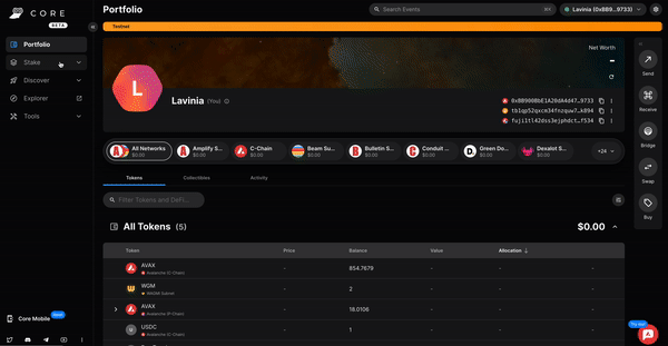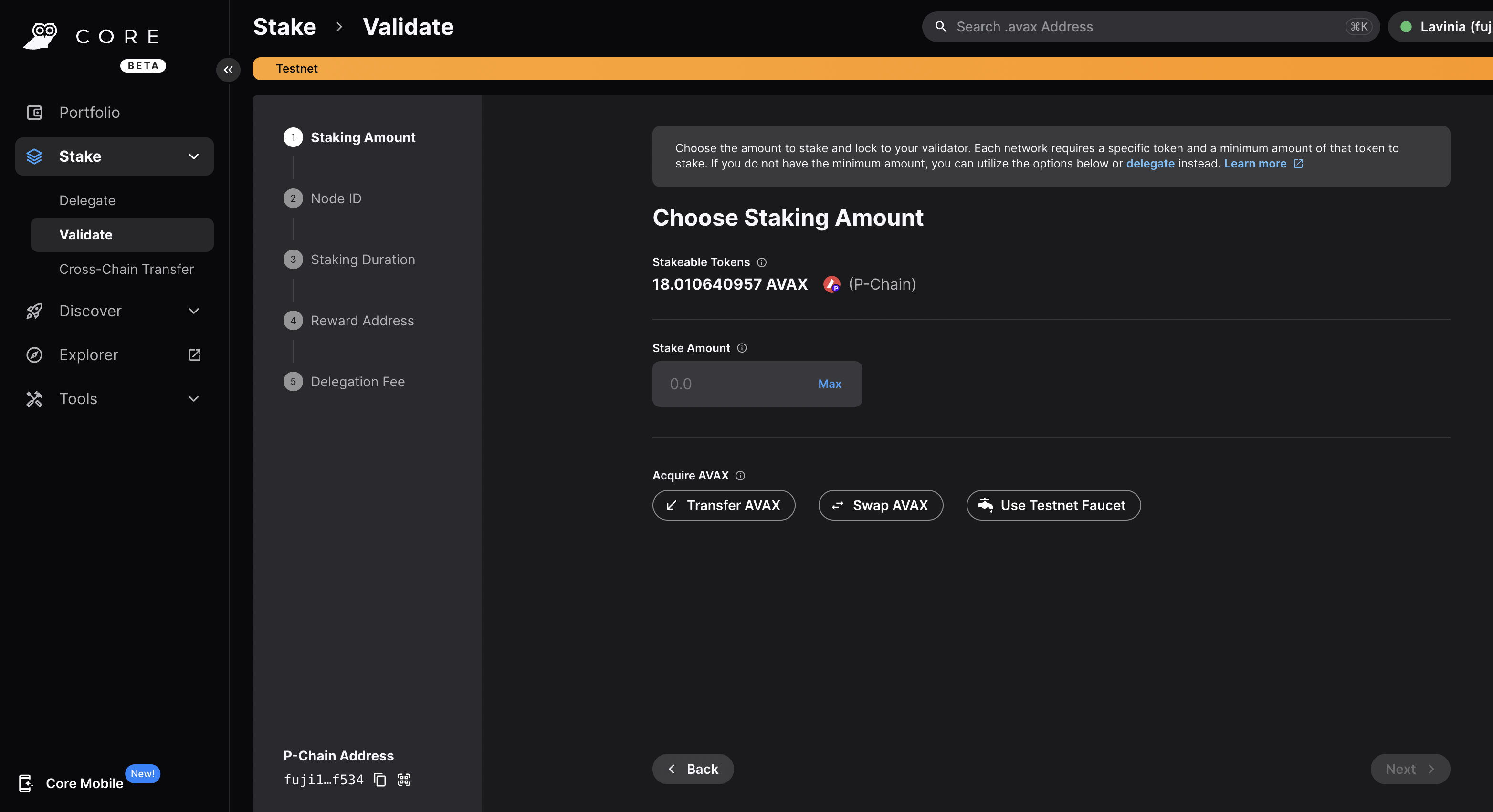 ### Benefits of a Builder Account - **Faucet**: With a Builder Account, you can claim testnet AVAX on the C-Chain and P-Chain right from the Builder Console without the need of a coupon code or holding a mainnet balance. - **Free Managed Testnet Infrastructure**: With a Builder Account, we will provide free managed testnet nodes and ICM relayers for your L1. This infrastructure is not suitable for production use, but it is great for testing and development. # Install Core Wallet (/academy/avalanche-fundamentals/04-creating-an-l1/02-connect-core) --- title: Install Core Wallet description: Learn how to install the Core wallet browser extension and create a wallet. updated: 2025-03-13 authors: [owenwahlgren] icon: Wallet --- In this section you will learn how to set up Core wallet and get some testnet AVAX on the P-Chain so you can launch your first L1. ### Download Core Wallet If you don't have Core Wallet installed already, download the Core Extension for Chrome: [Core Wallet Extension](https://chromewebstore.google.com/detail/core-crypto-wallet-nft-ex/agoakfejjabomempkjlepdflaleeobhb) Core is the only wallet that supports issuing P-Chain transactions, so it is not possible to use other wallets such as MetaMask or Rabby. ### Create a Wallet in Core Create a new wallet in Core by clicking the `Continue with Google` or by manually creating a new Wallet. Congratulations! You have successfully set up your Core wallet. # Claim Testnet Tokens (/academy/avalanche-fundamentals/04-creating-an-l1/02a-claim-testnet-tokens) --- title: Claim Testnet Tokens description: Learn how to connect Core wallet and claim testnet AVAX. updated: 2025-03-13 authors: [owenwahlgren] icon: Coins --- Connect your Core wallet below to claim testnet AVAX on the C-Chain and P-Chain. With a Builder Hub account, **tokens are automatically sent to your wallet** - no manual claims or coupon codes needed! **Automated Faucet:** Once you connect your wallet with a Builder Hub account, testnet tokens are automatically sent to your wallet when needed. You can also manually request tokens using the buttons above. ## Alternative Faucet If you don't want to create a [Builder Hub Account](https://build.avax.network/login), you can use the external [Avalanche Faucet](https://core.app/tools/testnet-faucet/?subnet=c&token=c) with coupon code `avalanche-academy` or `avalanche-academy25` to get 2 AVAX on the C-Chain. After you have claimed some AVAX on the C-Chain, you can bridge it to the P-Chain using this tool: # Network Architecture (/academy/avalanche-fundamentals/04-creating-an-l1/03-network-architecture) --- title: Network Architecture description: Learn about the network architecture of Avalanche and the role of the P-Chain. updated: 2025-03-13 authors: [owenwahlgren] icon: BookOpen --- To create an L1 you need to follow these steps: 1. Create a Subnet record on the P-Chain with the `CreateSubnet` transaction 2. Add one or more chains to the Subnet with the `CreateChain` transaction 3. Convert the Subnet to an L1 and add the initial validators with the `ConvertSubnetToL1` transaction Let's dive into what that means: ## Validators in a Multi-Chain Network Validators are nodes of a blockchain that secure the network by validating the transactions. Each L1 in the Avalanche network has it's own set of validators that is running the `AvalancheGo` client. L1 Creation ## Platform Chain The Platform Chain is the backbone for the native interoperability of the Avalanche network. It is a registry of all validators in the Avalanche network. This includes the validators of the Primary Network (including the C- and P-Chain), as well as all L1s and legacy Subnet validators. For each validator the P-Chain stores the following information: - A unique node ID identifying the validator - A BLS Public Key - The Stake Weight - The Balance of the Validator for the continous interoperability fee following graphic shows a simplified data model of the P-Chain: P-Chain Architecture Builders can create new L1 blockchains in the Avalanche Network by issuing transactions on the P-Chain. The P-Chain runs a special-purpose virtual machine called the [platformvm](https://github.com/ava-labs/avalanchego/tree/master/vms/platformvm). It is not EVM-based and therefore to interact with it you need a compatible wallet like Core wallet. Creating new records for L1 blockchains on the P-Chain is done by issuing transactions like the `CreateSubnetTx`. The P-Chain is secured by the Primary Network validators. L1 validators are syncing the P-Chain, meaning they always have the latest view of the validator set of all blockchains in the Avalanche network, but are not participating in the consensus of the P-Chain. ## Subnets When the Avalanche network was created the architecture included the concepts of Subnets. Subnets are blockchains that were validated by a *subset of the Primary Network validators*. Each Primary Network validator can be a member of multiple subnets, and each Subnet can have multiple validators. Since Primary network validators have to fullfil the Primary Network staking requirements of `2,000 AVAX`, this was also necessary for every validator that was validating a Subnet. There was no option to opt-out of validating the Primary Network. Primary Network